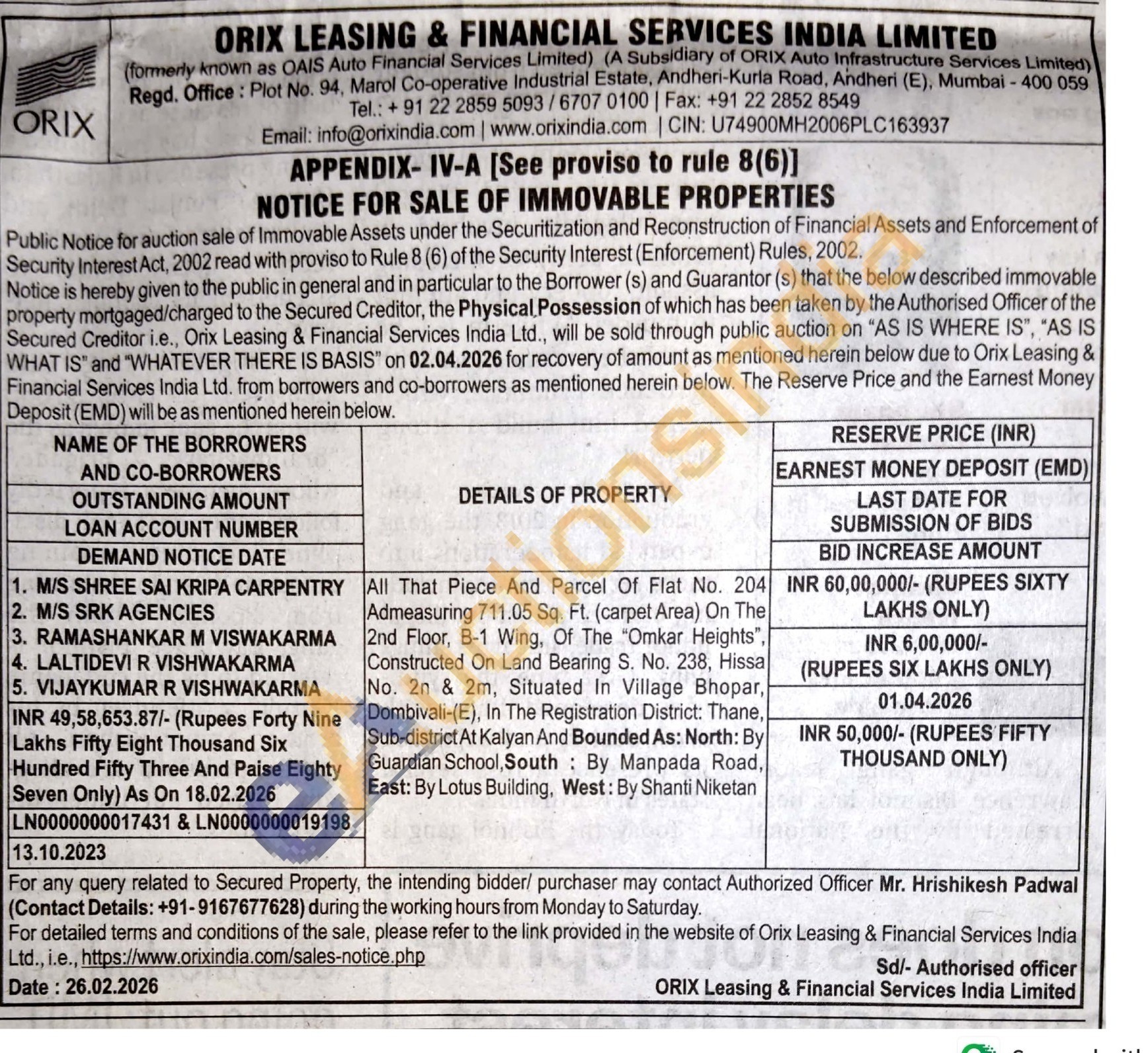 contact Authorized Officer Mr. Hrishikesh Padwal ( Contact Details: +91-9167677628