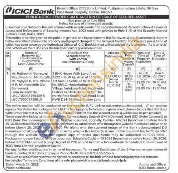 2 BHK House With Land Area 3122 in Built Up Area of 1100 In 2.9 Ares (7 Cents) In in Re Survey No. 90/1C, Nadakkuthazha Village, Vatakora Taluk, Kozhikode District 673104. Bounded On The North: Park South: Pwb Road East PWB D14-56 West: Private Land