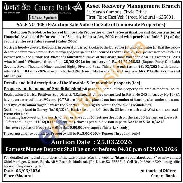 Property in the name of P.Aadhilakshmi:All part and parcel of the property situated at Madurai south Registration District, Peraiyur Sub District, T.Kallupatti Village comprised in Patta No 243 in survey No.10/3A having an extent of 1 acre 90 cents (0.77.0 ares) which is plotted out into number of housing sites under the name and style of Ramunni Nagar in which the plot No. 10 housing site within the following boundaries: North: Punja land in Survey No:10/2D2A East: site of park-1 South: 23 feet breadth east-West common road West: Plot No.9 Measuring East-west on the north 47 feet, on the south 47 feet, north-south on the east 30 feet and on the west 30 feet totalling to 1410 Sq ft. (130.99 sq. mt.). Now as per sub division in patta No243 in S.No10/3A1A