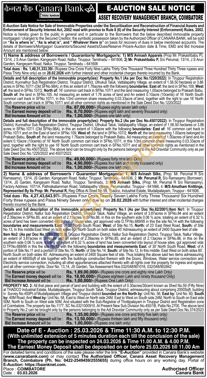 PROPERTY NO. 2: All that piece and parcel of land and building with the extent of 0.30acres/30cent known as Shed No.59 (Fifty Nine) at THADCO Industrial Estate, Mudalipalayam, Tiruppur South Taluk, Tiruppur District, admeasuring about comprising 2000Sqft, building in Survey No.450Pt of Mudalipalayam Village and Tiruppur district bounded on the North by: Unit No. 56, East by: Unit No. 60, South by: 40M Road, And West by: Unit No. 58, East to West on North side 24M, East to West on South side 24M, North to South on East side 50M, North to South on West side 50M, And situated with the Sub-Registrar of Thottipalayam in Tiruppur District and Registration zone of Coimbatore. The property tax No. 1177, SC No.0321000910. At Present New Sub Division No.450/1B, Patta No. 2700. The above land in Property No.2 can be brought only by the persons belonging to the Adi Dravidar Community only as per Sale Deed Doc No.374/2023