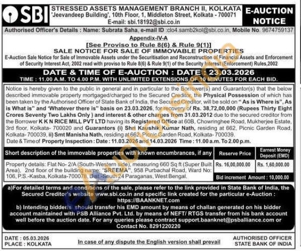 Property details: Flat No-2/A (South-Western side), measuring 660 Sq ft (Super Built Area), 2nd floor of the building name: 'SREEMA", 958 Purbachal Road, Ward No: 106, P.S.-Kasba, Kolkata-700078, Dist.-South 24 Paraganas, West Bengal.