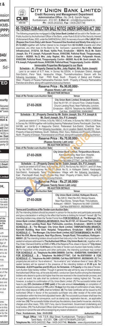 Land to an extent of 5.67 Ares, in Survey No. 1437/2, Re-Survey No. 190/21/1, and 0.61 Ares in Sy No. 1437/1, Re-Survey No. 190/21, Block No.15, in Kottayam District, Kanjirapally Sub-District, Kanjirapally Taluk, Chirakkadavu Village with the following boundaries East: Panchayath Road, South Private Way, West: Property of Salim, North Property of Karikunnel, along with superstructure putup thereon.