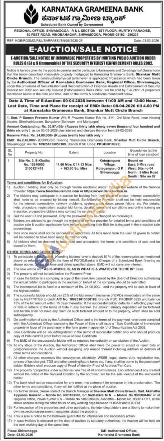 Property no Site No. 1, E-Khatha No. 15240050 2100121419 Extent 11.00 Mirs X 14.13 Mirs 163.90 Sq. Mtrs location Koteganguru Village, Kateganguru GP, Shivamogga