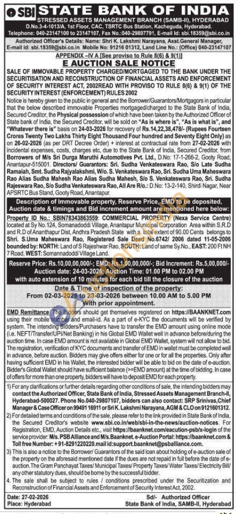 Property ID No.: SBIN78343863559: COMMERCIAL PROPERTY (Nexa Service Centre) located at Sy No. 124, Somanadoddi Village, Anantapur Municipal Corporation Area within S.R.D and R.D of Ananthapur Dist, Andhra Pradesh State with a total extent of 90.00 Cents belongs to Shri. S.Uma Maheswara Rao, Registered Sale Deed No.6742/ 2006 dated 11-05-2006 bounded by: NORTH: Land of S Rajeshwar Rao, SOUTH: Land of same Sy.No., EAST: 200 FINH 7 Road, WEST: Somannadoddi Village Land.