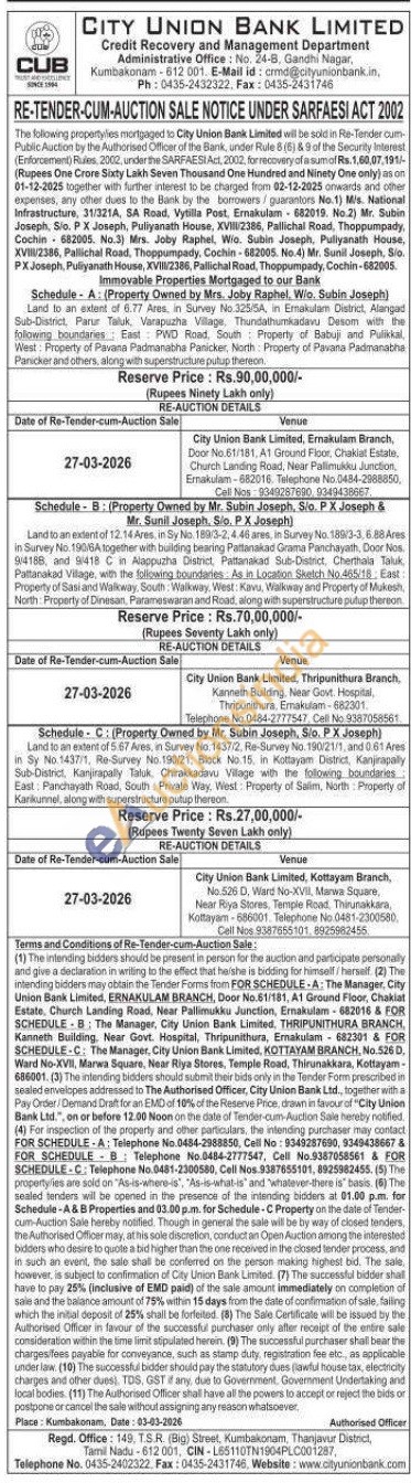 Land to an extent of 5.567 Ares, in Survey No. 1437/2, Re-Survey No. 190/21/1, and 0.61 Ares in Sy No 1437/1, Re-Survey No. 190/21, Block No 15, in Kottayam District, Kanjirapally Sub-District, Kanjirapally Taluk, Chirakkadavu Village with the following boundaries East Panchayath Road, South Privale Way, West: Property of Salim, North Property of Karikurnel, along with superstructure putup thereon.