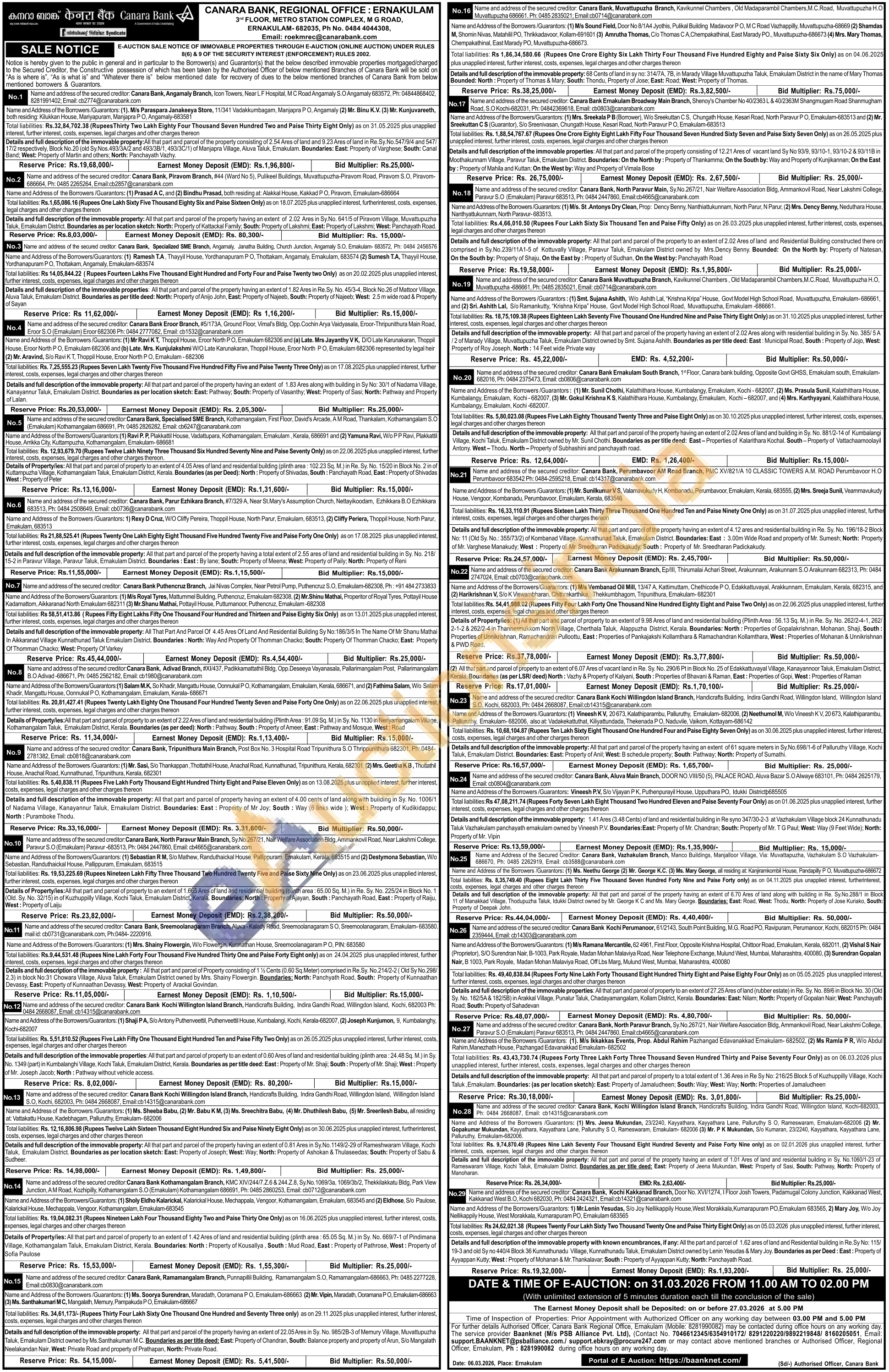 Contact Ph: 0484 2777082, Email: cb1532@canarabank.com