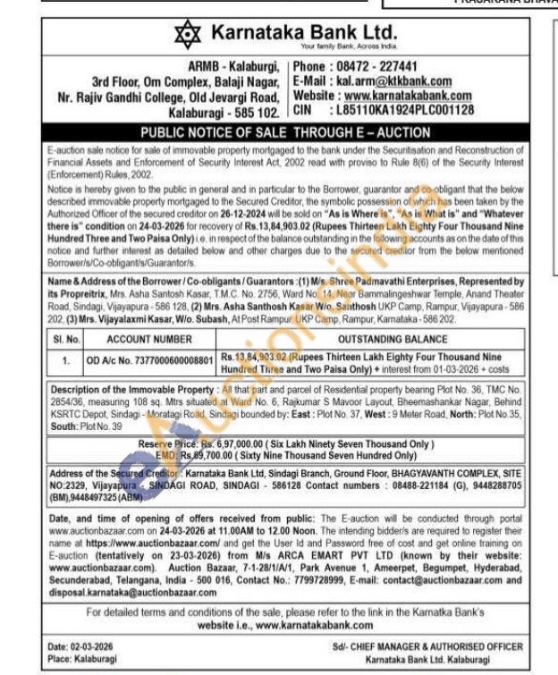 Description of the Immovable Property: All that part and parcel of Residential property bearing Plot No. 36, TMC No. 2854/36, measuring 108 sq. Mtrs situated at Ward No. 6, Rajkumar S Mavoor Layout, Bheemashankar Nagar, Behind KSRTC Depot, Sindagi-Moralagi Road, Sindagi bounded by: East: Plot No. 37, West: 9 Meter Road, North: Plot No. 35, South: Plot No. 39