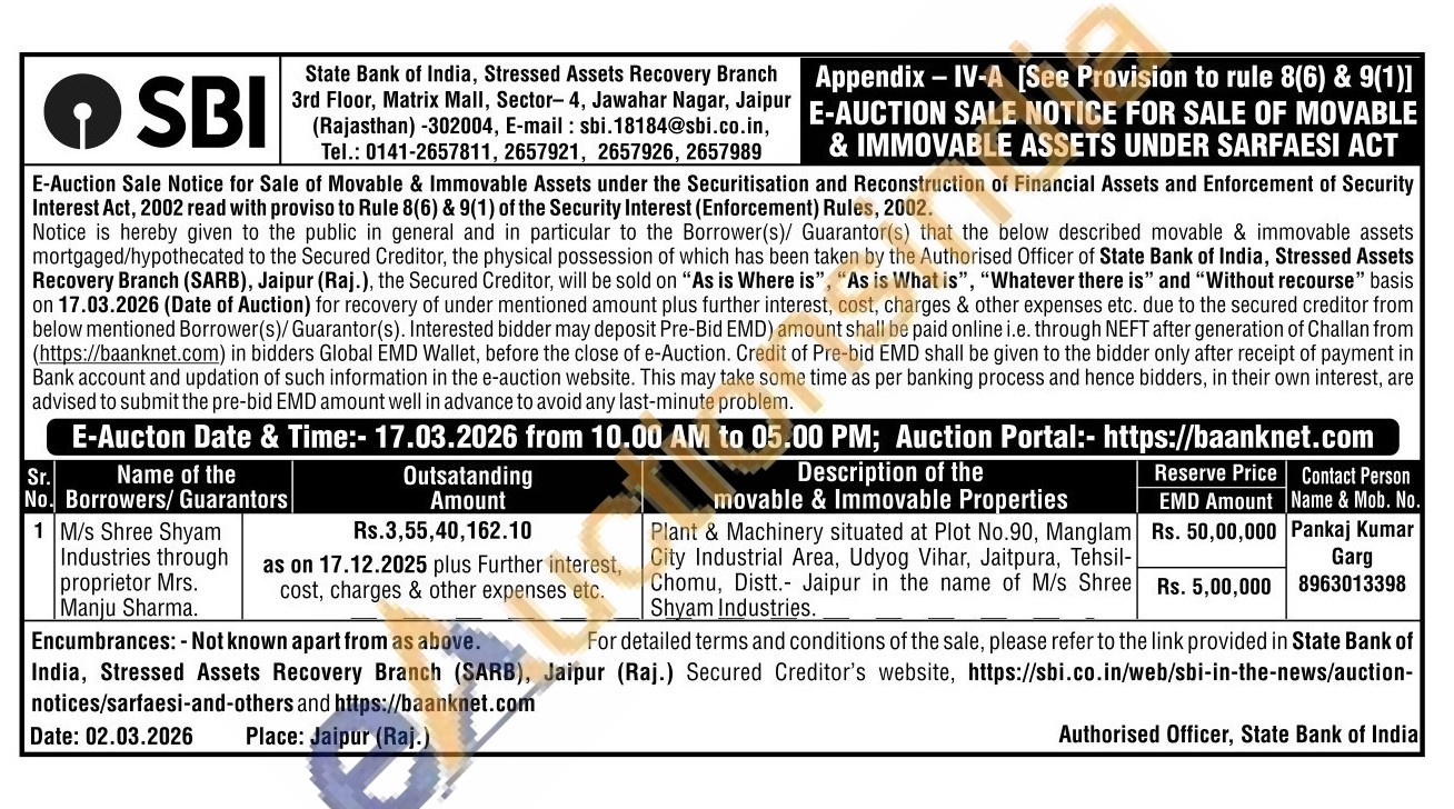 Plant & Machinery situated at Plot No.90, Manglam City Industrial Area, Udyog Vihar, Jaitpura, Tehsil-Chomu, Distt. Jaipur in the name of M/s Shree Shyam Industries.