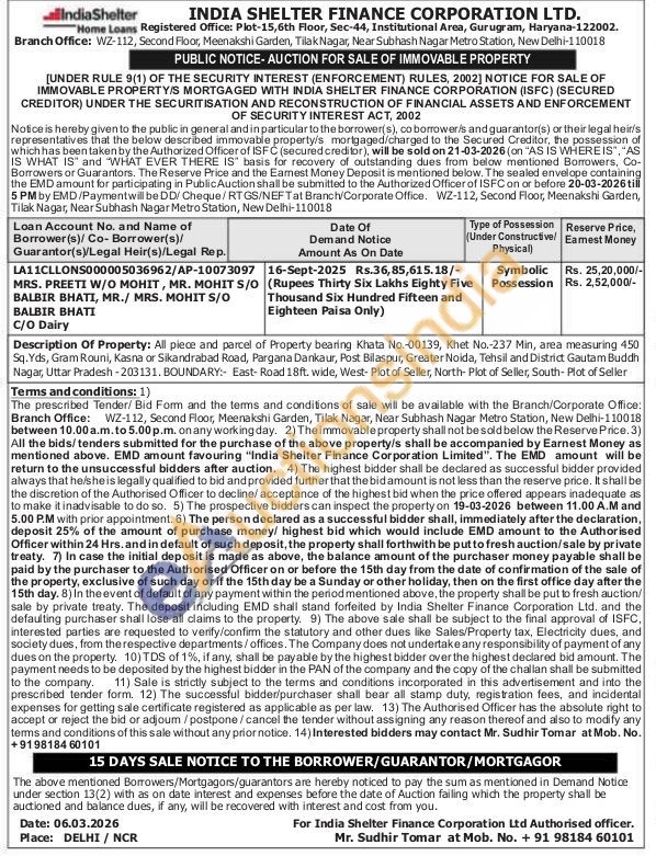 Description Of Property: All piece and parcel of Property bearing Khata No.-00139, Khet No.-237 Min, area measuring 450 Sq. Yds, Gram Rouni, Kasna or Sikandrabad Road, Pargana Dankaur, Post Bilaspur, Greater Noida, Tehsil and District Gautam Buddh Nagar, Uttar Pradesh-203131. BOUNDARY: East-Road 18ft. wide, West- Plot of Seller, North- Plot of Seller, South-Plot of Seller