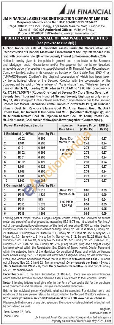 Forming part of Project "Marvel Ganga Sangria" constructed by the Borrower on all that piece and parcel of land or ground ad measuring 55,916.73 sq. mtrs. bearing Plot No. A out of the sanctioned layout in respect of the land admeasuring 67,950 sq. mtrs. bearing Survey No. 20/8/1/21/1/2/22/1/2 (earlier bearing Survey No. 20 Hissa No.8/1, Survey No. 21 Hissa No. 1, Survey No. 21 Hissa No. 1/1, Survey No. 21 Hissa No. 1/2 Survey No. 21 Hissa No. 1/3 Survey No. 21 Hissa No. 1/4 Survey No. 21/2, Survey No.22 Hissa No. 1, Survey No.22 Hissa No. 1/1, Survey No. 22 Hissa No. 1/2 Survey No. 22 Hissa No. 1/3 Survey No. 22 Hissa No. 1/4 Survey No. 22/2 (Part) situate, lying and being at Village Mohammedwadi within the Registration Sub-District of Taluka Haveli, District Pune and within the extended limits of the Municipal Corporation of Pune, and which contiguous block ad measuring 55916.73 sq.mtrs has now been assigned Survey No.20/8/21/22/1/2-Plot A, and which is bounded as follows that is to say: On or towards the East - By lands out of Survey Nos. 20, 21 and 22, Mohammedwadi, On or towards the South - By road On or towards the West - By road, On or towards the North - By land out of Survey No. 20, Mohammedwadi
