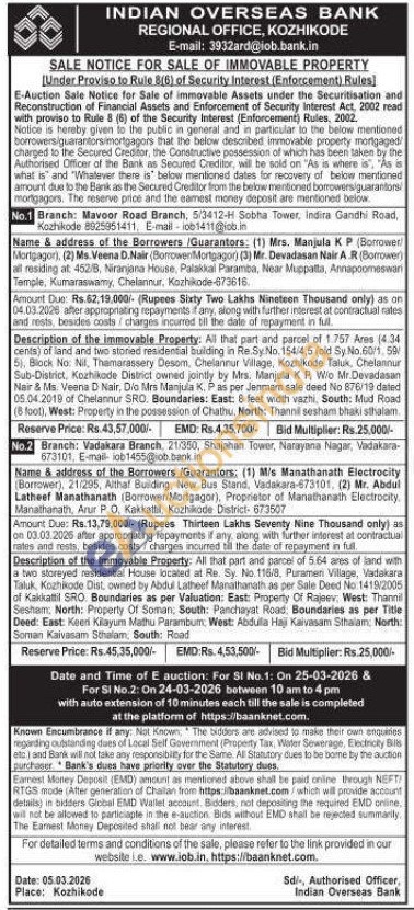 Description of the immovable Property: All that part and parcel of 1.757 Ares (4.34 cents) of land and two storied residential bulding in Re Sy No. 154/4,5 (old Sy No.60/1, 50/5), Block No: Nil, Thamarassery Desom, Chelannur Village, Kozhikode Taluk, Chelannur Sub-District, Kozhikode District owned jointly by Mrs. Manjula KP, W/o Mr.Devadasan Nair & Ms. Veena D Nair, Dio Mrs Manjula K. P as per Jenmam sale deed No 876/19 dated 05.04.2018 of Chelannur SRO, Boundaries: East: 8 feet width vazhi, South: Mud Road (8 foot), West: Property in the possession of Chathu, North: Thannil sesham bhaki sthalam
