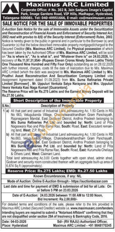 b) All that part and parcel of Industrial Land admeasuring Ac. 1.50 Cents in RS No.663, Velugubanda Village, Chakradwarabhandham Gram Panchayath, Rajanagaram Mandal, East Godavari District, Andhra Pradesh belonging to Mis Suma Refineries Pvt Ltd. and bounded by: North: Land of Pilla Nageswara Rao and Pilla Rana Rao, South: Road, East: Kurumulla Chellaya & Others Land, West: Claimant Land.