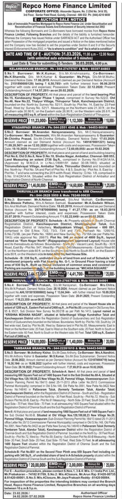 DESCRIPTION OF PROPERTY: Schedule-A: Property situated in South Chennai Registration District, Kancheepuram District, Sholinganallur Taluk, Sub Registration District of Velachery, Madipakkam Village, Chennai 600 091. comprised in Old S.Nos. 73/2, 73/3, 73/4 and 73/5, Paimash No. 1295/10, S.No.73/38, (as per Patta No. 1680) and New Survey No. 73/18A (as per Patta No. 1943) vide approval No. 268/73. Plot No. 546 an extent of 4800 Sq.ft., layout named as "Ram Nagar North" (Rajagopalapuram approved Layout) House site and its thereabouts as follows: Boundaries-North By Vacant Land, South By-30f Road, East By Plot No. 547, West By Plot No. 545 Measurements: East to West 60 ft on the Northern side 60 ft. on the Southern side North to South 80 ft. on the Eastern side 80 ft, on the Western side In total 4800 Sq. feet House Site. Schedule-8:338 Sq.ft., undivided share of land from and out of Schedule "A" mentioned property with Flat bearing No, G-1, in Ground Floor having a total area of 930 Sq.ft., Built up House inclusive of common areas and covered car Parking are numbered as G-1 of the building known as "MICASA SQUARE