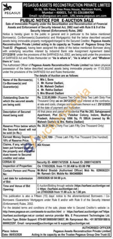 All that piece and parcel of residential Flat No 203, Sahajanaand Apartment, Plot No.11, Palsikar Colony, Indore, Madhya Pradesh, Admeasuring 1096 Sq. Ft SBUA (owned by Mr. Mahesh Dadlani & Mrs. Rekha Dadlani)