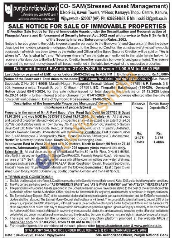 In between East to West 29.5 feet or 9.00 meters, North to South 90 feet or 27.45 meters, Admeasuring 2655 square feet or 295 square yards vacant site only. Schedule-B: All that piece and parcel of residential Flat No.501 in 5th Floor, D No 5-1-66/501, Ward No 5, in survey number 113, 114, Sarojini Devi Road Old Maternity Hospital Road), admeasuring an area of 1274 Sq Ft including common area with all the common utilities over water, drainage, passages and stairs etc at "BRAHMANI PLAZAA" Balaji Registration District, Tirupathi Sub-District, Tirupathi Town and Tirupathi Urban Mandal with the following Boundaries: East: Open to sky, West: Open to Sky, North: Open to Sky, South: Common Corridor and then Flat No 502