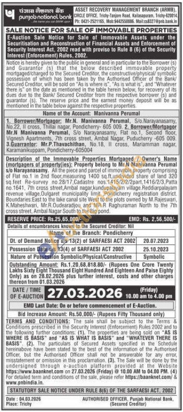 Description of the Immovable Properties Mortgaged Owner's Name (mortgagers of property(ies): Property belong to Mr.N Manivanna Perumal s/o Narayanasamy. All the piece and parcel of immovable property comprising of Flat no.1 in 2nd floor, measuring 1400 sq.ft undivided share of land 320 sq.feet Re-survey no. 28/17, Cadastre nos.1415/2/2/2part,1416/2/3, Patta no.1641, 7th cross street, Ambal nagar,kundupalayam village. Reddiarpalayam revenue village, Oulgaret municipality limit Pondicherry registration district. Boundaries East to the lake canal site West to the plots owned by M.Rajeswari, K.Maheshwari, Mr.R.Oudearadjou and MR.R Raghuraman North to the 7th cross street, Ambal Nagar South to the Big pond