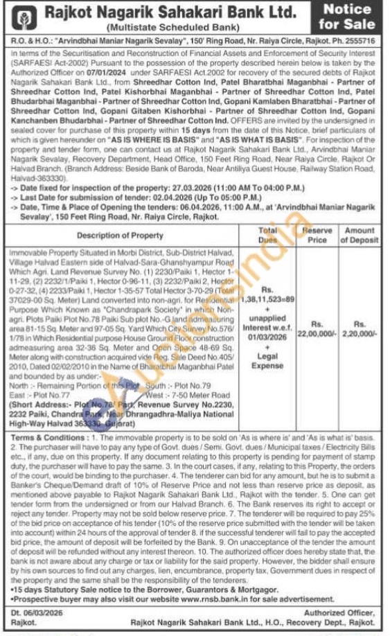 Immovable Property Situated in Morbi District, Sub-District Halvad, Village Halvad Eastern side of Halvad-Sara-Ghanshyampur Road Which Agri. Land Revenue Survey No. (1) 2230/Paiki 1, Hector 1-11-29, (2) 2232/1/Paiki 1, Hector 0-96-11, (3) 2232/Paiki 2, Hector 0-27-32, (4) 2233/Paiki 1, Hector 1-35-57 Total Hector 3-70-29 (Total 37029-00 Sq. Meter) Land converted into non-agri. for Residential Purpose Which Known as "Chandrapark Society' in which Non-agri. Plots Paiki Plot No.78 Paiki Sub plot No.-Gland admeasuring area 81-15 Sq. Meter and 97-05 Sq. Yard Which City Survey No.575/1/78 in Which Residential purpose House Ground Floor construction admeasuring area 32-36 Sq. Meter and Open Space 48-69 Sq. Meter along with construction acquired vide Reg. Sale Deed No:405/2010, Dated 02/02/2010 in the Name of Bharatbhai Maganbhai Patel and bounded by as under-North Remaining Portion of this Plot South: Plot No.79 East-Plot No.77 West-7-50 Meter Road (Short Address:- Plot No.78/ Part, Revenue Survey No.2230, 2232 Paiki, Chandra Park, Near Dhrangadhra-Maliya National High-Way Halvad 363330-Gujarat)