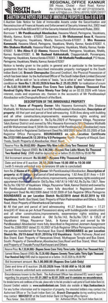 DESCRIPTION OF THE IMMOVABLE PROPERTYItem No.2: Name of Property Owner: Mr Pandikasalayil Aboobacker, Description of property: a) All that part and parcel of land admeasuring 1.62 Ares (0.81 Ares + 0.81 Ares) along with all other constructions, improvements, easementary rights existing and appurtenant thereon situated in Old Sy.Nos. 149/1A1 & 149/1A2, Re.Sy.No. 136/7, New Re.Sy.No. 136/101 of Vayakkara Village, Payyannur Taluk, Kannur District and owned by Mr Pandikasalayil Aboobacker more fully described in Registered Jenmam Assignment Deed No.462/2009 dated 10.02.2009 of Sub Registrar Office Peringome BOUNDARIES as per Location Sketch No.62/2019 dated 05.02.2019 by V.O Vayakkara, North: Bus Stand, East: Property of Paleri Padmanabhan and Others, South: Road, West: Property of Marathankoval Damodaran.