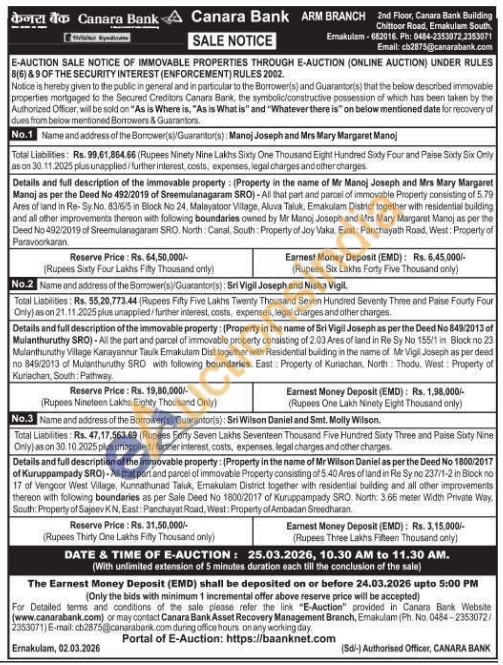Details and full description of the immovable property: (Property in the name of Sri Vigil Joseph as per the Deed No 849/2013 of Mulanthuruthy SRO)-All the part and parcel of immovable property consisting of 2.03 Ares of land in Re Sy No 155/1 in Block no 23 Mulanthuruthy Village Kanayannur Taulk Emakulam Dist fogether with Residential building in the name of Mr Vigil Joseph as per deed no 845/2013 of Muianthuruthy SRO with following boundaries. East Property of Kunachan, North Thodu. West: Property of Kuriachan, South: Pathway