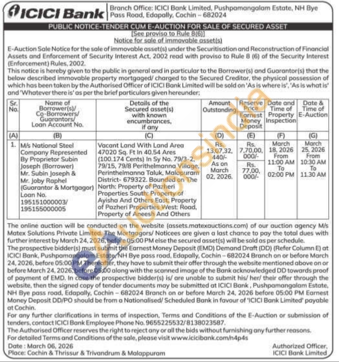 Vacant Land With Land Area 47020 Sq. Ft In 40.54 Ares (100.174 Cents) In Sy No. 79/3-2. 79/15, 79/8 Perithelmanna Village. Perinthelmanna Taluk, Malapuram District-679322. Bounded on The North: Property of Pazheri Properties South: Property of Ayisha And Others East: Property of Pazheri Properties West: Road, Property of Aneesh And Others