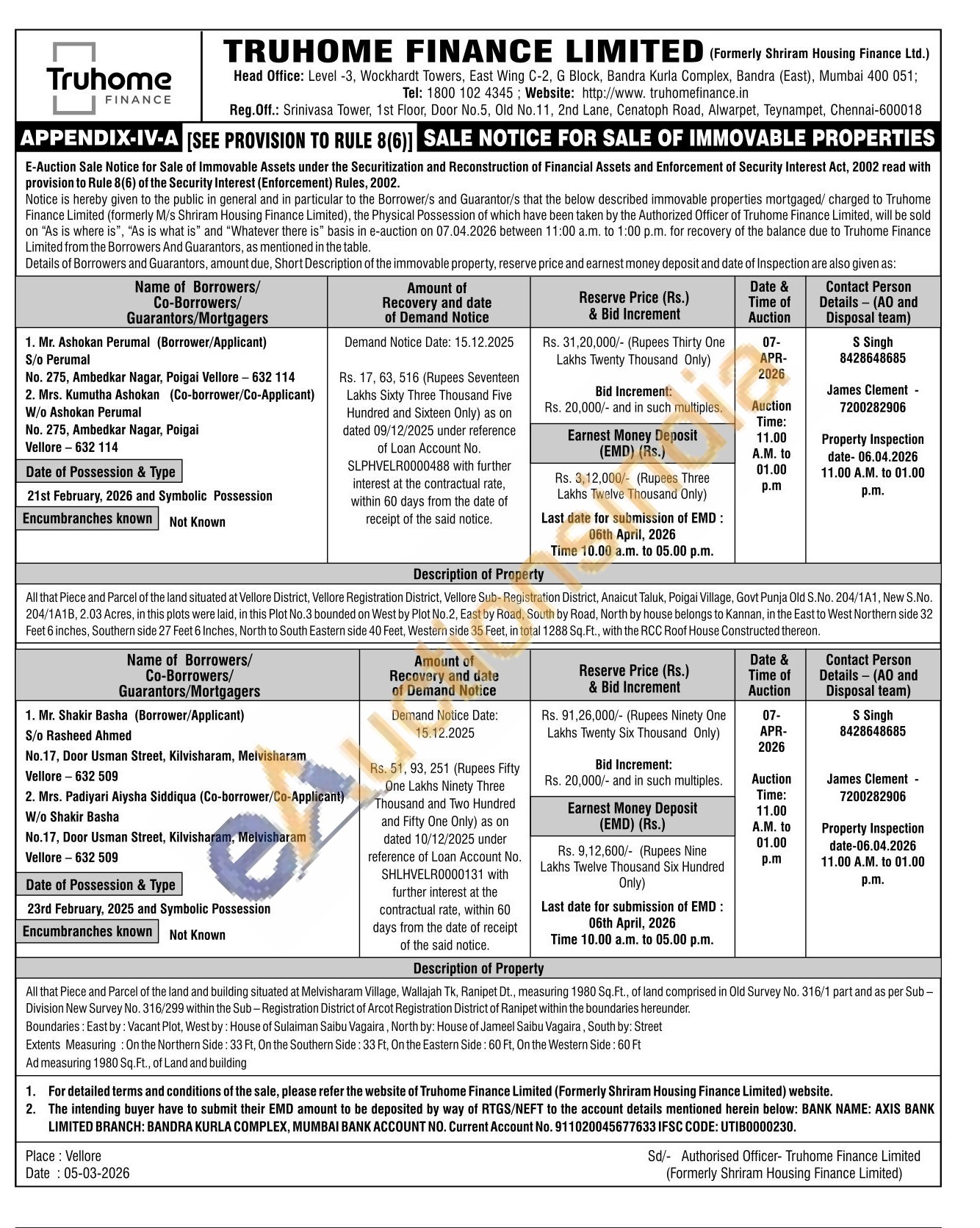 All that Piece and Parcel of the land situated at Vellore District, Vellore Registration District, Vellore Sub-Registration District, Anaicut Taluk, Poigai Village, Govt Punja Old S.No. 204/1A1, New S.No. 204/1A1B, 2.03 Acres, in this plots were laid, in this Plot No. 3 bounded on West by Plot No.2, East by Road, South by Road. North by house belongs to Kannan, in the East to West Northern side 32 Feet 6 inches, Southern side 27 Feet 6 Inches, North to South Eastern side 40 Feet, Western side 35 Feet, in total 1288 Sq. FL., with the RCC Roof House Constructed thereon.