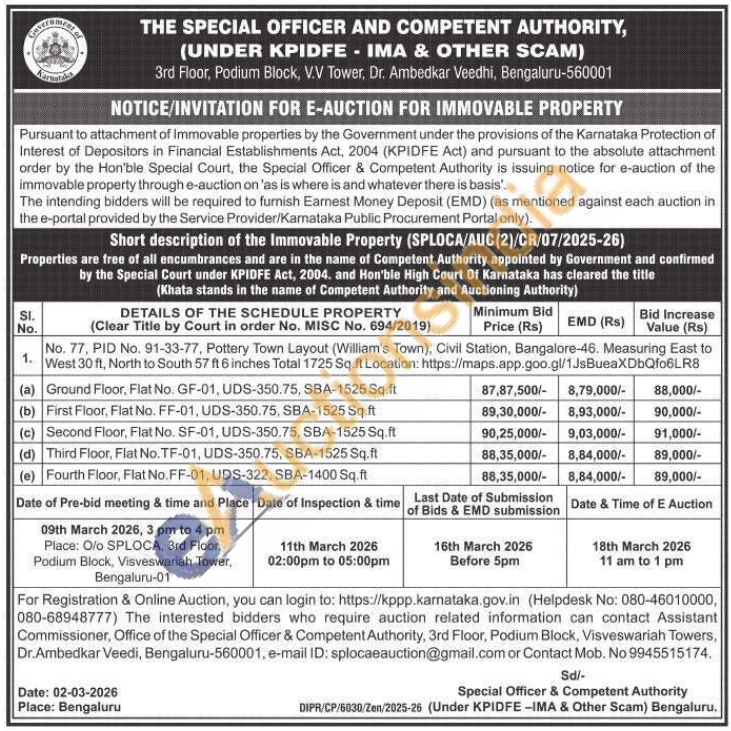 DETAILS OF THE SCHEDULE PROPERTY (Clear Title by Court in order No. MISC No. 694/2019) : No. 77, PID No. 91-33-77, Pottery Town Layout (William's Town), Civil Station, Bangalore-46. Measuring East to West 30 ft, North to South 57 ft 6 inches Total 1725 Sq.ft Location: https://maps.app.goo.gl/1JsBueaXDbQfo6LR8
