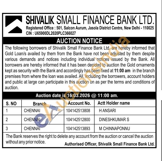 Shivalik Small Finance Bank Ltd Gold Auctions Auction in Chennai