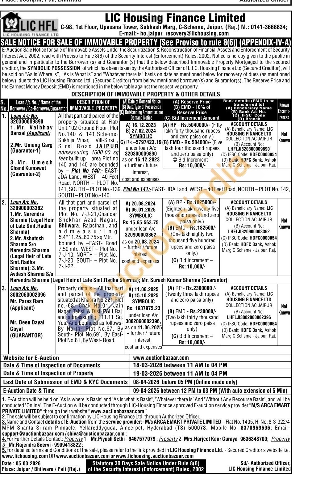 All that part and parcel of the property situated at Flat/Unit 102 Ground Floor, Plot No.140 & 141,Scheme-Sukhija Vihar, Vill-Sirsi Sirsi Road JAIPUR admeasuring 1600.00 sq feet built up area Plot no 140 and 140 are bounded by Plot No 140:- EAST-JDA Land, WEST-40 Feet eet Road, NORTH PLOT No. 141, SOUTH-PLOT No.-139 Plot No 141:-EAST-JDA Land, WEST-40 Feet Road, NORTH-PLOT No. 142 SOUTH-PLOT No.-140.