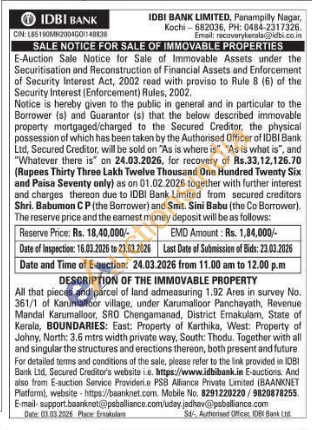 All that pieces and parcel of land admeasuring 1.92 Ares in survey No. 361/1 of Karumalloor village, under Karumalloor Panchayath, Revenue Mandal Karumalloor, SRO Chengamanad, District Ernakulam, State of Kerala, BOUNDARIES: East: Property of Karthika, West: Property of Johny, North: 3.6 mtrs width private way, South: Thodu. Together with all and singular the structures and erections thereon, both present and future