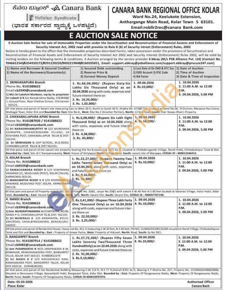 3 )All that part and parcel of Property with Sl.NO. 160, V.P.Katha No. 208/1, Janjar No. 208/1 with extent E-W 40 feet N-5 80 feet located at Vanarasi Village, Holur Habli, Kolar Taluk Bounded by: East: Vacant Site and Road, West: Tank, North: Vacant Site, South: Vacant Site, CERSAI ID: 400057767148.