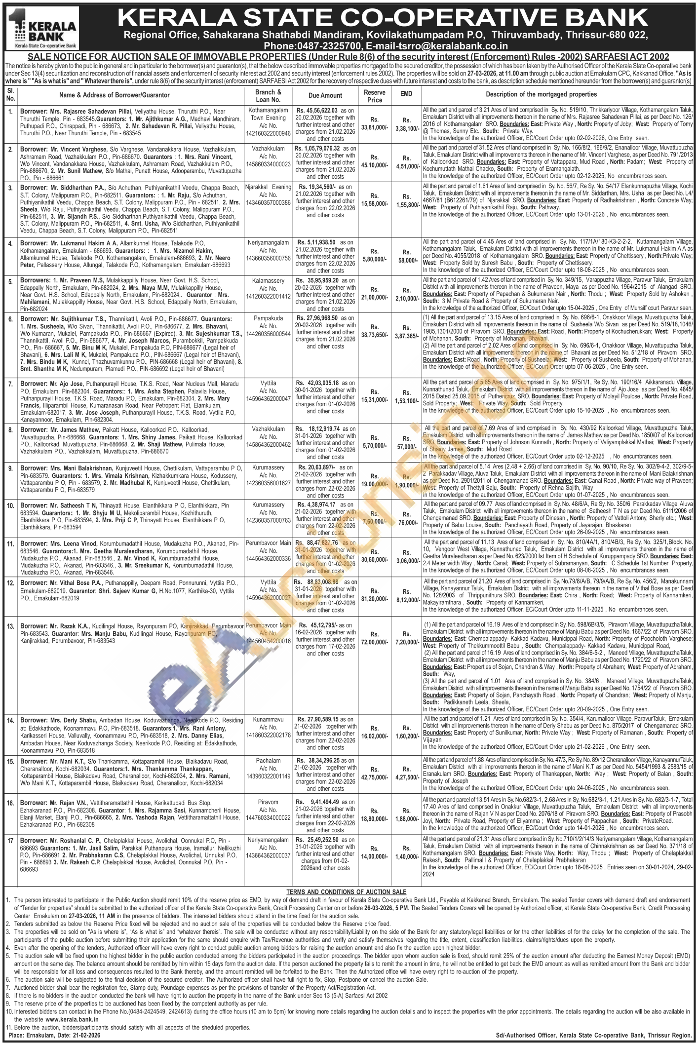 All the part and parcel of 13.51 Ares in Sy. No.682/3-1, 2.68 Ares in Sy. No.682/3-1, 1.21 Ares in Sy. No. 682/3-1-7, Total 17.40 Ares of land comprised in Onakkur Village, Muvattupuzha Taluk, Emakulam District with all improvements thereon in the name of Rajan V N as per Deed No. 2076/18 of Piravom SRO. Boundaries: East: Property of Prasobh Joyi, North: Private Road, Property of Eliyamma: West: Property of Pappachan, South: PrivateRoad. In the knowledge of the authorized Officer, EC/Court Order upto 14-01-2026, No encumbrances seen.