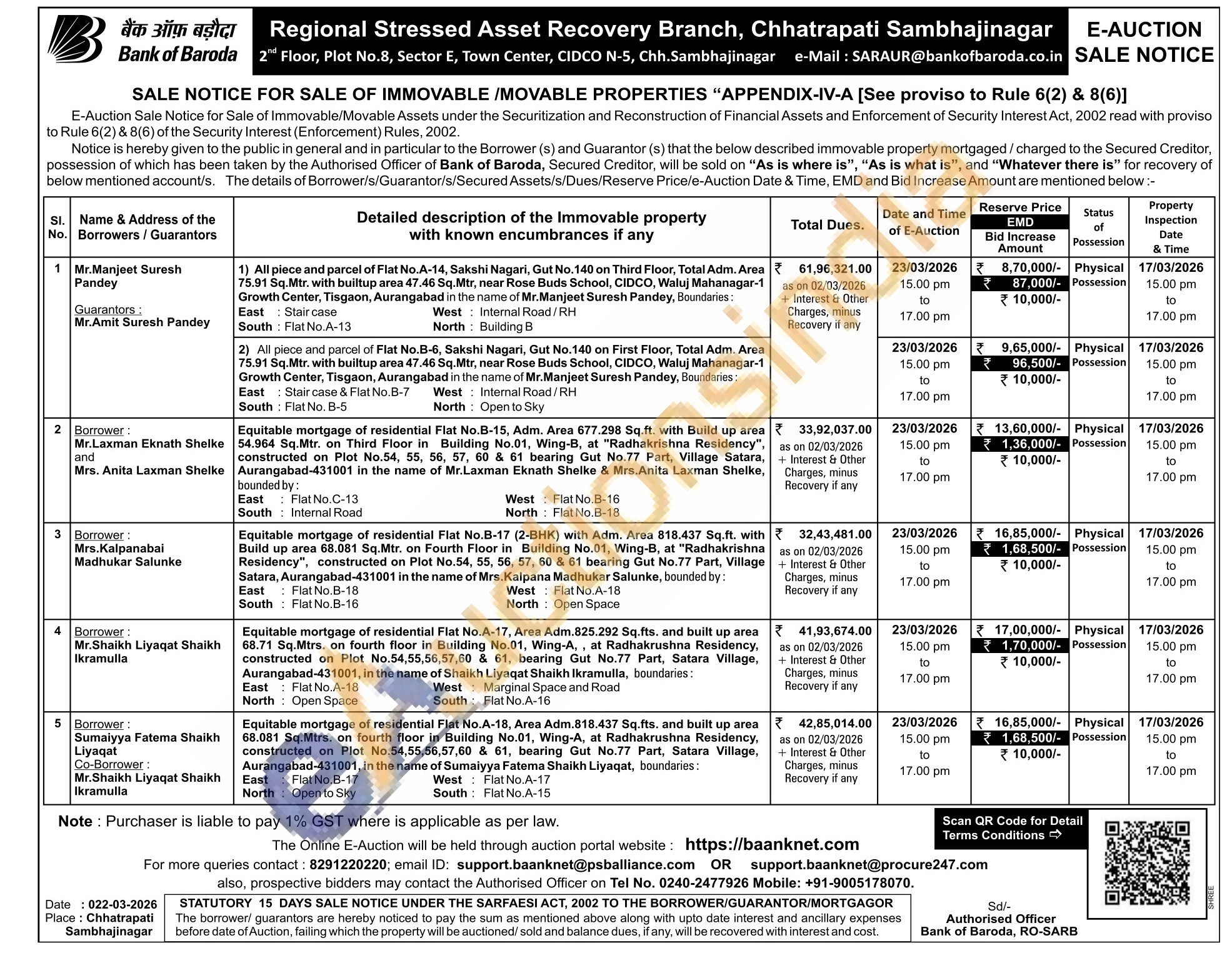 All piece and parcel of Flat No.A-14, Sakshi Nagari, Gut No. 140 on Third Floor, Total Adm. Area 75.91 Sq.Mtr. with builtup area 47.46 Sq.Mtr, near Rose Buds School, CIDCO, Waluj Mahanagar-1 Growth Center, Tisgaon, Aurangabad in the name of Mr.Manjeet Suresh Pandey