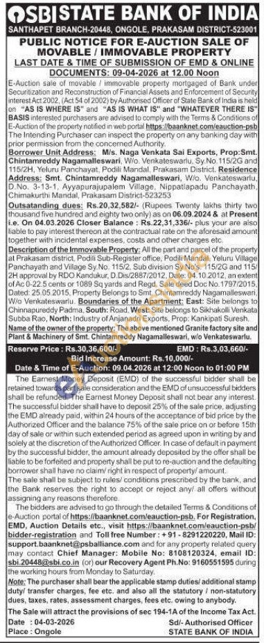 Name of the owner of the property: The above mentioned Granite factory site and Plant & Machinery of Smt. Chintamreddy Nagamalleswari, w/o Venkateswarlu