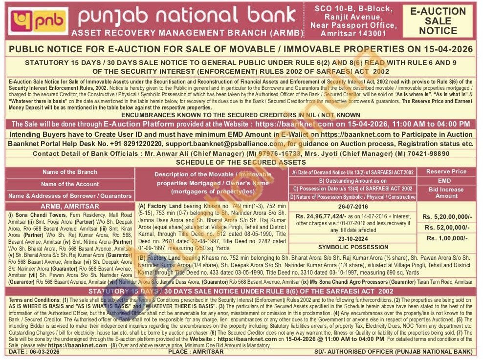 (A) Factory Land bearing Khasra no. 749 min(1-3), 752 min (5-15), 753 min (0-7) belonging to Sh. Narinder Arora Sio Sh. Jamna Dass Arora and Sh. Bharat Arora S/o Sh. Raj Kumar Arora (equal share) situated at Village Pingli, Tehsil and District Karnal, through Title Deed no. 512 dated 08-05-1990, Title Deed no. 2670 dated 22-08-1997, Title Deed no. 2782 dated 01-09-1997, measuring 7250 sq. Yards.