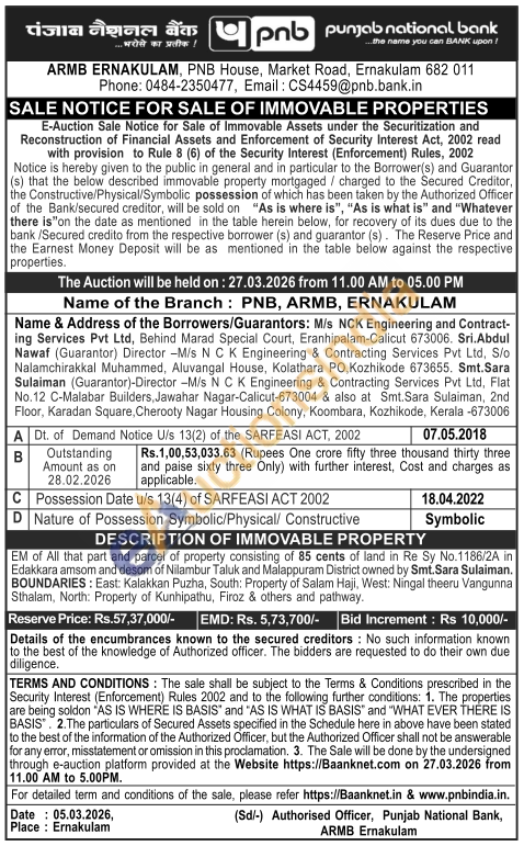 EM of All that part and parcel of property consisting of 85 cents of land in Re Sy No.1186/2A in Edakkara amsom and desom of Nilambur Taluk and Malappuram District owned by Smt. Sara Sulaiman. BOUNDARIES: East: Kalakkan Puzha, South: Property of Salam Haji, West: Ningal theeru Vangunna Sthalam, North: Property of Kunhipathu, Firoz & others and pathway