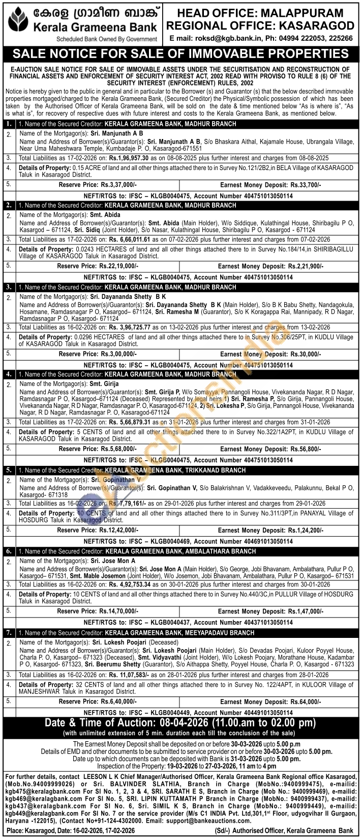 Authorised Officer Mob.No.94009999026) or Sri. BALVINDER SLATHIA, Branch in Charge (MobNo.:9400999475),