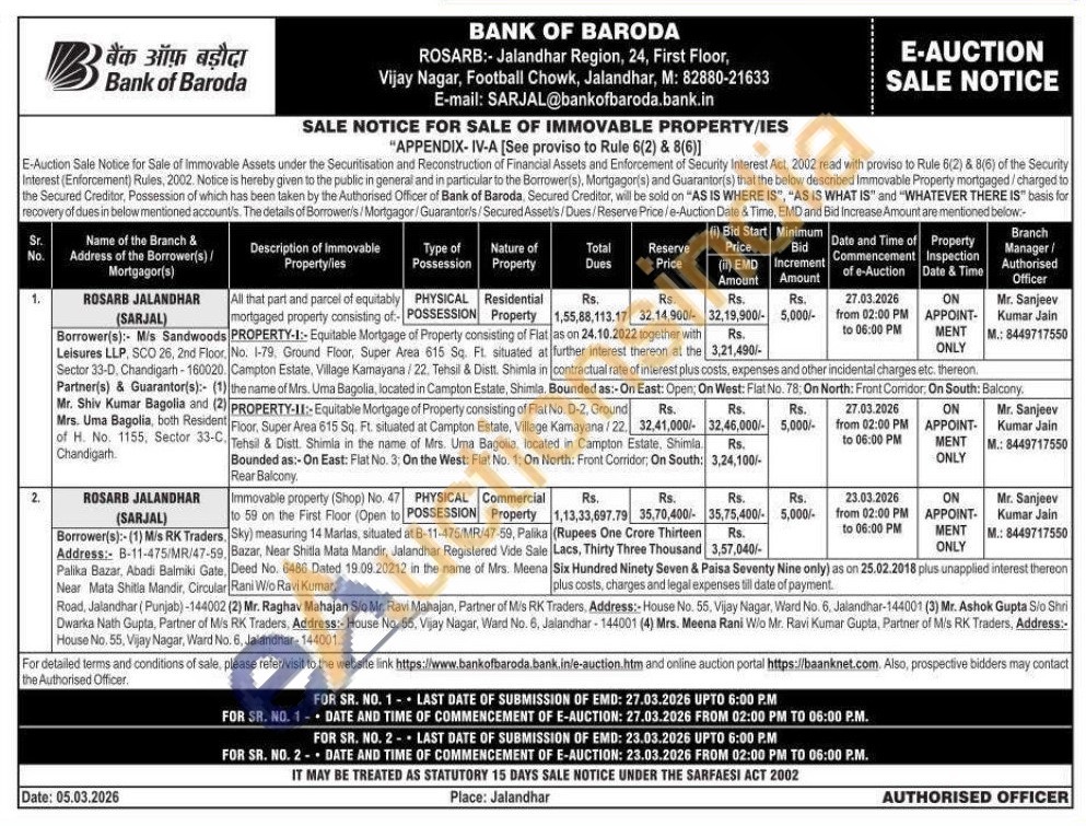 Immovable property (Shop) No. 47 to 59 on the First Floor (Open to Sky) measuring 14 Marlas, situated at B-11-475/MR/47-59, PalikaBazar, Near Shitla Mata Mandir, Jalandhar Registered Vide Sale Deed No. 6486 Dated 19.09.20212 in the name of Mrs. Meena Rani W/o Ravi Kumar