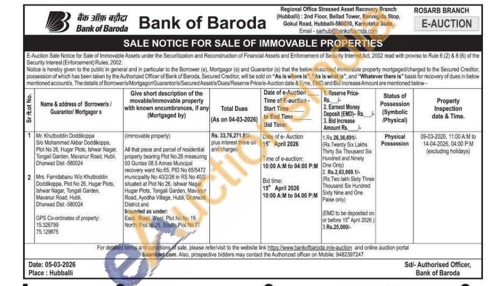 All that piece and parcel of residential property bearing Plot No.26 measuring 00 Guntas 08.5 Annas Muncipal recovery ward No 65, PID No 65/5472 municipality No 40/2/26 in RS No 40/2 situated at Plot No 26, Ishwar Nagar, Hugar Plots, Tongali Garden, Mavanur Road, Ayodha Village, Hubli, Dharwad District and bounded as under: East: Road, West: Plot No No 19 North: Plot No25, South: Plot No 27