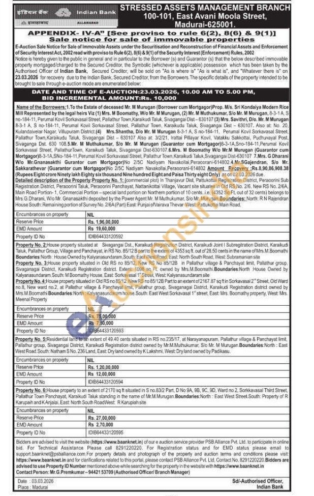 Detailed description of the Property Property No. 1: (commercial plot) in Thanjavur Dist, Pattukottai Registration District, Peracorini Sub Registration District, Peraconini Taluk, Peracorini Panchayat, Nattanikottai Village, Vacant site situates in Old RS No. 2/6. New RS No. 2/6A, Main Road Portion-1, Commercial Portion-special land portion on Northern portion of 10 cents, ie, (4352 Sq Ft, out of 32 cents) belongs to Mrs. G.Dharani, W/o Mr. Gnanasakthi deposited by the Power Agent Mr. M Muthukumar, Sio Mr. Murugan Boundaries: North: RN Rajendran House South: Remaining portion of Survey No. 2/6A (Part) East: Punjai of Vairava Thevar West: Pattukottai Main Road