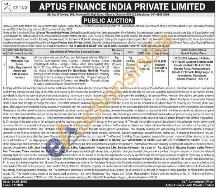 All that piece and parcel of land and building at Krishna-District-Vuyyuru -Sub registrar Office -Vuyyuru Mandal-Katuru Grama Parachayath- Katuru --Village- R.S.No-205/1, RCC Building Door No:3-133, Ground Floor-In These An Extent Of-150 Sq Yards Or 126 Sq Meters is Being Bounded By:- Boundaries: North By: Property belongs to vandhanapu Venkata Balakrishnarao South By: Property belongs to Butra Jayarama Sharma East By: Property belongs to Katuru Lakshmisharvani & Common way West By: Property belongs to Kaluru Venkata Satyası ramachandramurthy