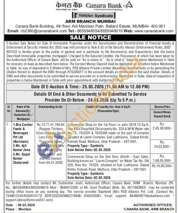 Commercial Shop on the 1st Floor i.e; adm 2678.73 Sq.ft, One Kitta Shop/Hall, Old property No. 329 & NFW Water rate No. 7E, 79/325F & 79/325M made on the part of Complex Situated at Laxmi Complex, Gali Ludhiyana, Dalpat Khirki, Kotwali Road, Mathura, Uttar Pradesh - 2811001. Property Type:- Symbolic Sale Notice Date:-02.03.2026