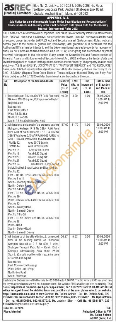 Al that piece of the office Unit no.2, on ground floor in the building known as Shahupuri Complex situated at C S No 590, E ward, Shahupuri Vyapari Peth, Tal Karvir, Dist -Kolhapur admeasuring Area about 25.00 Sq.mtr. (Carpet) together with mezzanine area of Carpet 4.08 Sq.mtr