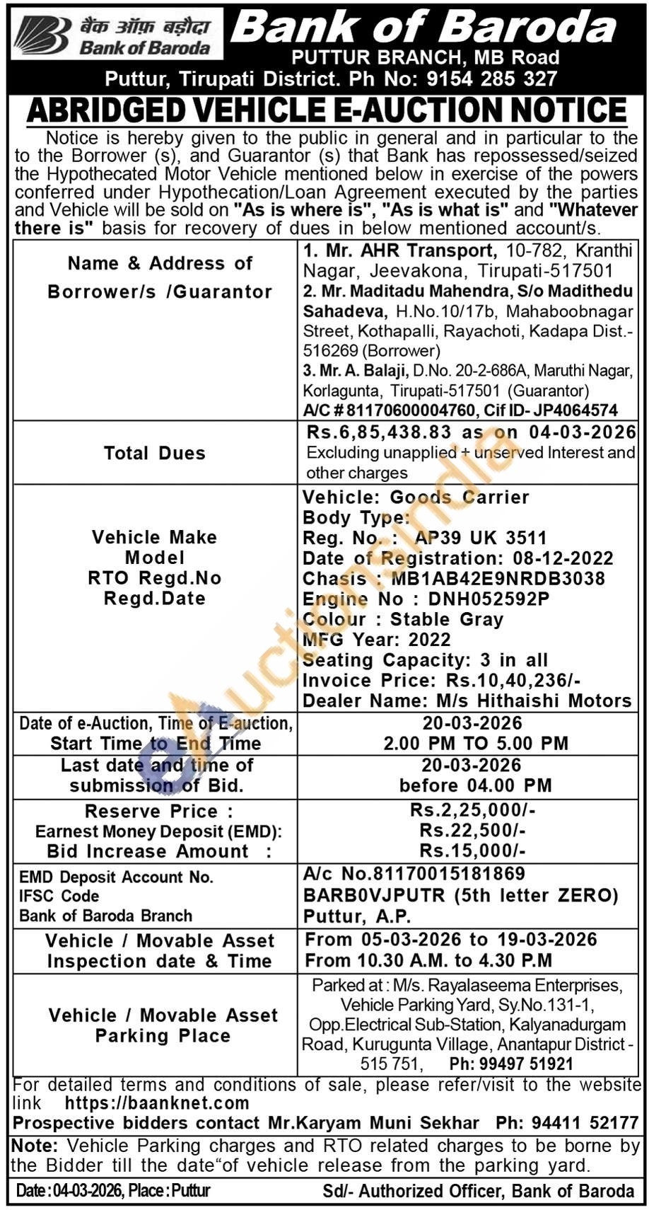 Invoice Price: Rs.10,40,236/-Dealer Name: M/s Hithaishi Motors