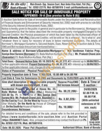 Residential Property situated at House No. 23. Bada Muthon ka Bass, PALI (RAJ) Measuring 533.50 Sq. Ft. in the name of Mrs Soniya Devi Surana W/ Mr. Prakash Chand Jain, Bounded by : On the East by Road, De the West by House of Chun Ghar Mohalla. On the North by House of Chhagan L. On the South by House of Hastimal