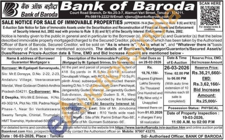 All the part and parcel of property to an extant of 418 Sq.yards in R.S.No.240/18 situated Devulapalli Village, with RCC building (710 Sq. Ft. plinth Area) subsequently constructed therein bearing D.No. 1-12 of Devulapalli Gram Panchayat. Jangareddy Gudem Mandal, Jangareddy Gudem Sub-division, Jangareddy Gudem S. R., West Godavari District, A.P., bounded by the following Boundaries: CERSAI Security Interest Id: 400018722914: East: Site of Mr. Jonuboina Sankarudu-57, West: R10 Yards wide road-57'10", North: Site of Mr. Parimi Srihari Rao-66, South: Site of Mr. Gunnam Subbarao-66