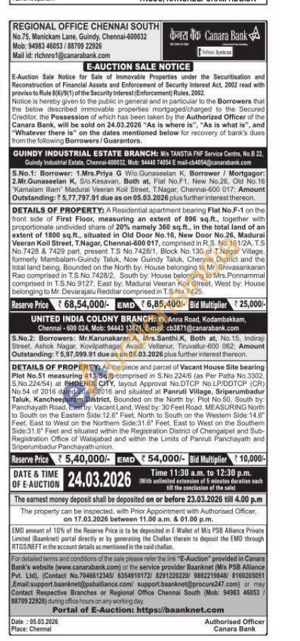 DETAILS OF PROPERTY: All the piece and parcel of Vacant House Site bearing Plot No.51 measuring 413 Sq.ft comprised in S.No.224/6 (as Per Patta No.3302. S.No.224/54) at PHOENIX CITY, layout Approval No.DTCP No.LP/DDTCP (CR) No.54 of 2016 dated 20.04.2016 and situated at Panruti Village, Sriperumbadur Taluk, Kancheepuram District, Bounded on the North by: Plot No.50, South by Panchayath Road, East by: Vacant Land, West by: 30 Feet Road: MEASURING North to South on the Eastern Side: 12.6" Feet, North to South on the Western Side 14.6" Feet, East to West on the Northern Side:31.6" Feet. East to West on the Southern Side:31.6" Feet and situated within the Registration District of Chengalpet and Sub-Registration Office of Walajabad and within the Limits of Panruti Panchayath and Sriperumbadur Panchayath union.