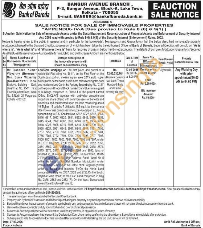 Equitable Mortgage of All that piece and parcel of a residential Flat being No. "D-11", on the First Floor on the South-East portion, measuring an area 2015 sq.ft. super built up area be the same a little more or less and right to park one medium sized Car in the Parking Space being No. 'C-21' on the Ground Floor of Block named 'Dark Blue' forming part of buildings comprised in Phase I of the project named IDEAL ENCLAVE together with undivided proportionate impartible share of land with common users of benefits and amenities and constructed upon the land measuring about 19 Bighas 15 cottahs 7 chittacks 19.8 sq.ft. be the same a little more or less comprised in Mouza-Gopalpur, J.L. No. 2, appertaining to R.S. Khatian Nos. 6842, 6927, 6843, 6861, 6816, 6817, 6987, 6920, 6841, 6952, 6849, 6860, 6859, 6845, 6844, 6922, 6862, 6850, 6846, 6923, 6984, 6921, 6918, 6926, 6925, 6919, 6985, 6818, 8391, 7799, 6948, 6950, 6924, 6951, 6949, 6947, 6848, 6847, 7861, 7756, 7757, 7758, 7759, 7760, 7761, 7781, 7782, 7783, 7784, 7785, 7786, 7792, 7793, 7794, 7795, 7796, 7797, 7798, 7800, 7801, 7802, 7803, 7804, 7805, 7806 and 7807, under R.S/L.R. Dag Nos. 2730, 2731, 2732, 2737, 2852, 2853, 2854, 2860, 2861, 2863, 2864, 2865, 2866, 2868, 2874, 2875, 2876, 2877, 2879, 2880, 2881 and 2883, lying or situated in Municipal Holding Nos. RGM-21/343, RGM- 21/1483 and RGM-29/1480, Rajarhat Road, Ward No 5 within the limits of Rajarhat Gopalpur Municipality, under Police Station-Airport, in the District of 24 Parganas (North) which is Butted and bounded By:On the North: Land comprised in Dag No. 2727, 2726 and 2725:On the South: Rajarhat Main Road: On the East: Land comprised in Dag No. 2878, 2882 and 2883 (P): On the West: Demarcated area of Ideal Enclave (Phase II)