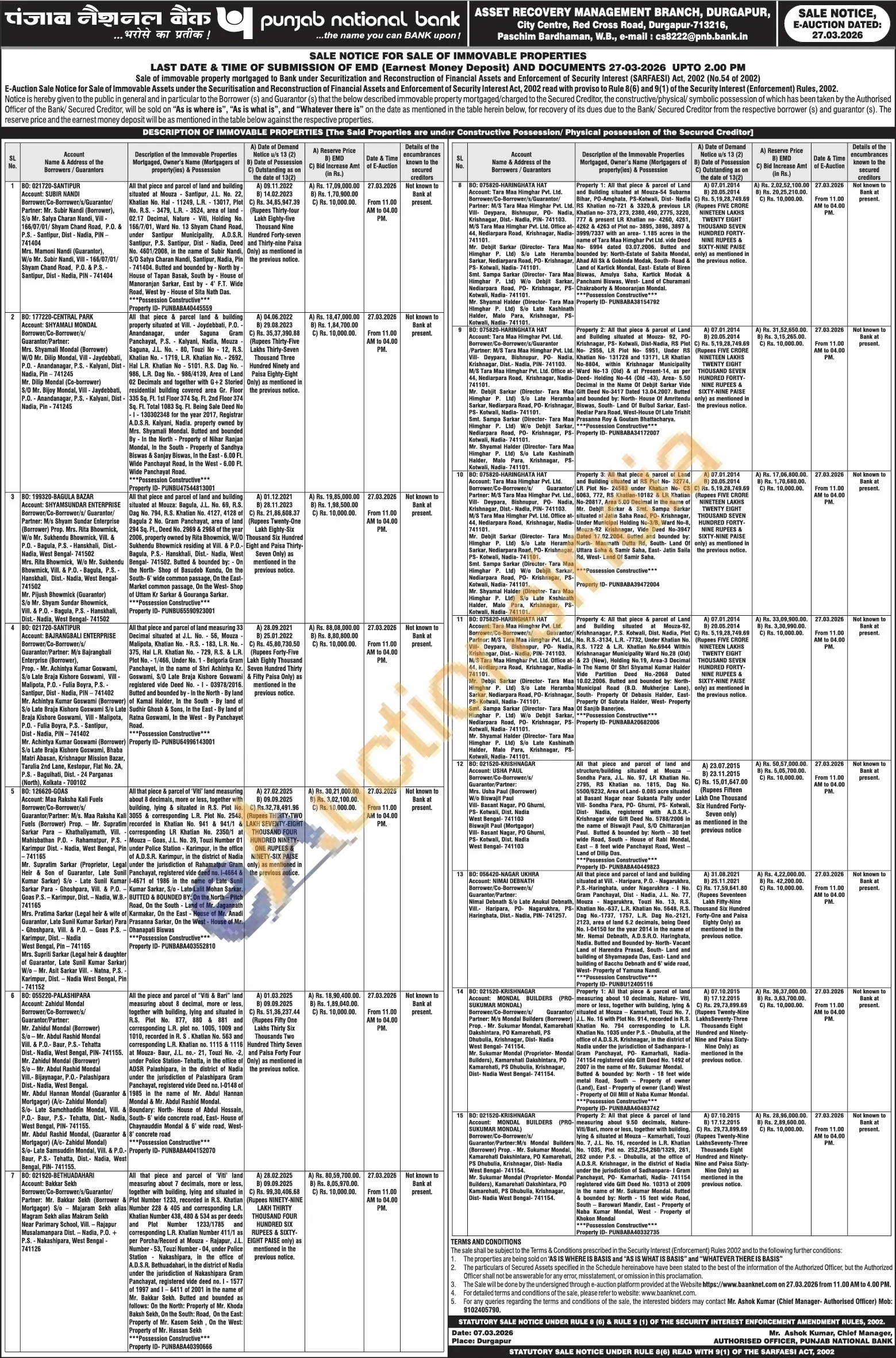 contact Mr. Ashok Kumar (Chief Manager- Authorised Officer) Mob: 9102405790.