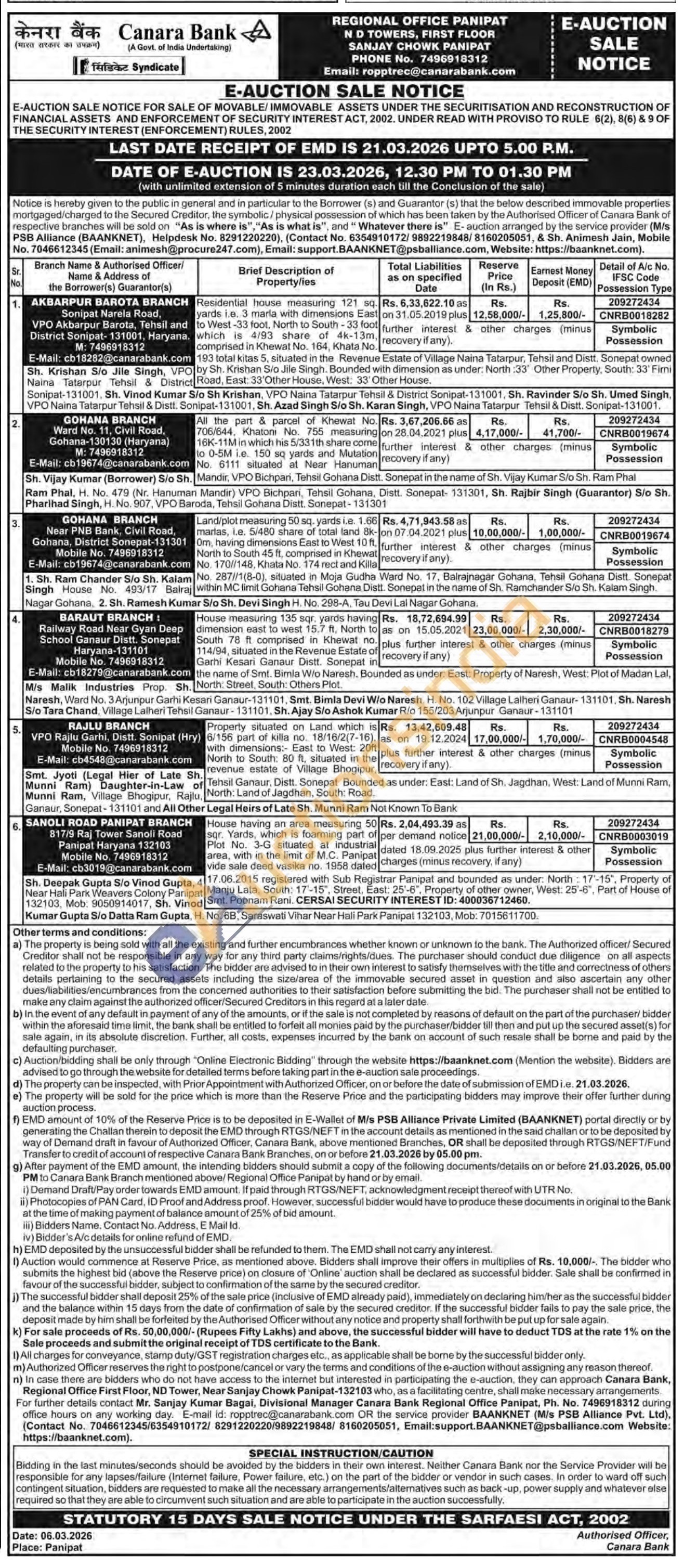 6) House having an area measuring 50 sqr. Yards, which is foarming part of Plot No. 3-G situated at industrial area, with in the limit of M.C. Panipat vide sale deed vasika no. 1958 dated 417.06.2015 registered with Sub Registrar Panipat and bounded as under. North 17-15", Property of Manju Lata, South: 17-15", Street, East: 25'-6", Property of other owner, West. 25-6, Part of House of Sint. Poonam Rani. CERSAI SECURITY INTEREST ID: 400036712460