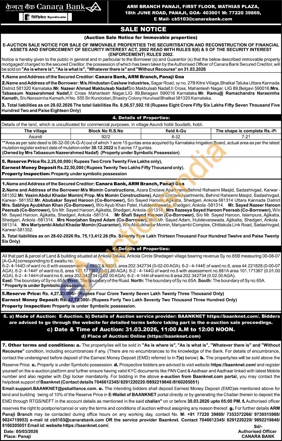 "Area as per sale deed is 06-32-00 (A-G-A) out of which 1 acre 15 guntas area acquired by Karnataka Irrigation Board, actual area as per the latest mutation register extract date of mutation order 30.12.2022 is 5 acres 17 guntas. (Owned by Mrs Tabassum Nazeerahmed Nadaf) (Property under Symbolic Possession)